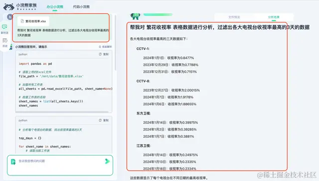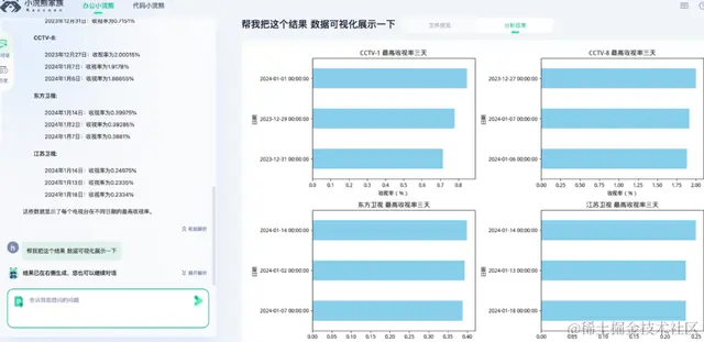 然后我们现在要这个收视率的数据进行挖掘分析,比如我们要列出各大电视台的收视率最高的3天的数据,如果这活是以前我们还需要学python或者百度一下excel的高级用法,去过滤提取,现在用了小浣熊办公助手,都是分分钟搞定,你只需要提问题即可,我们看一下效果: