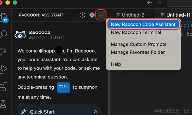登入之后,我们就可以打开小浣熊助手进行快速写代码了。点击小浣熊图标,然后选择右边3个点按钮,选择新建一个小浣熊编程助手即可。
