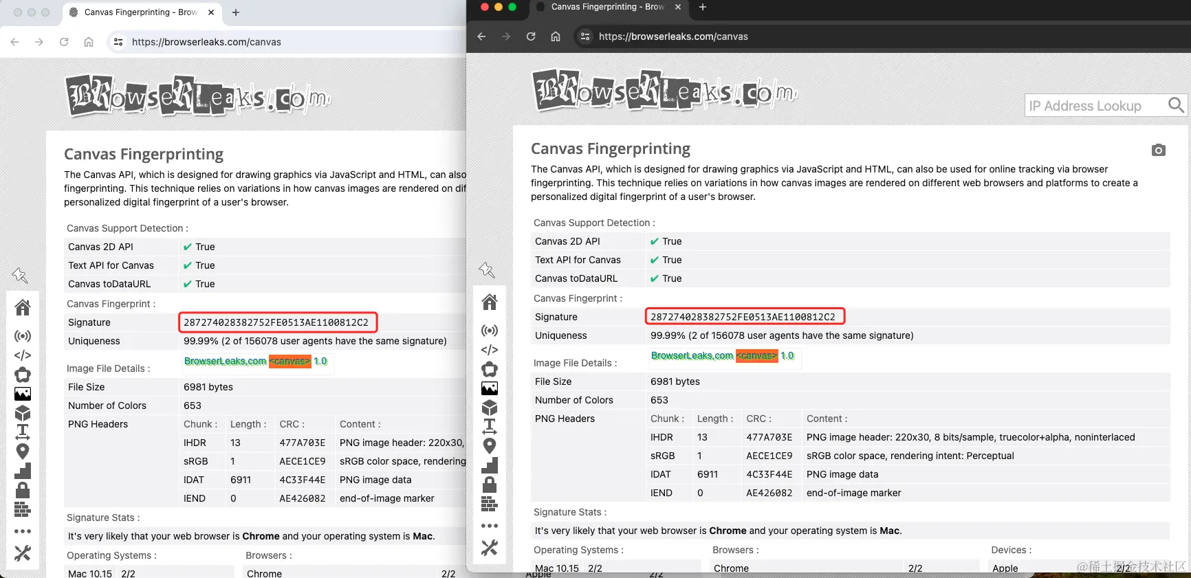 我们直接看成品,利用普通模式和无痕模式打开这个测试网站,就能发现2个哈希值是完全一样的,并且是每15万个用户中有2个人可能是相同的哈希值,唯一性达到了99.99%。