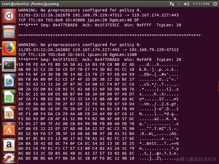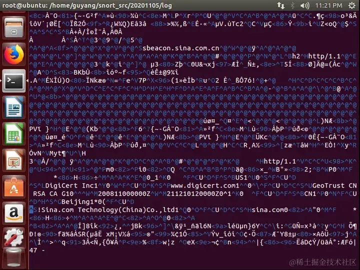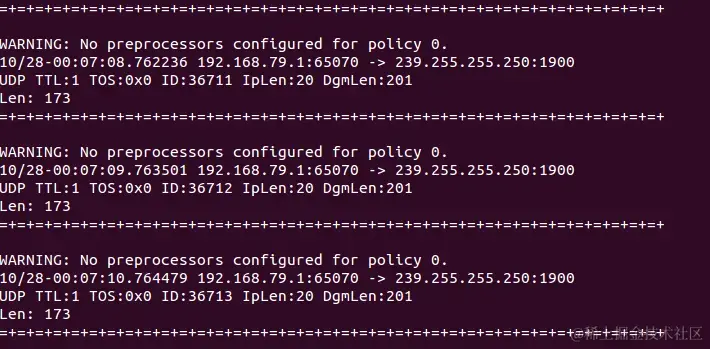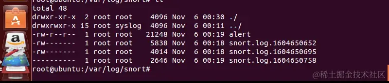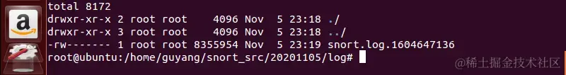 如果要把所有的包记录到硬盘上,你需要指定一个日志目录,snort就会自动记录数据包,命令采用探测+记录的方式: ./snort -dev -l ./20201105/log