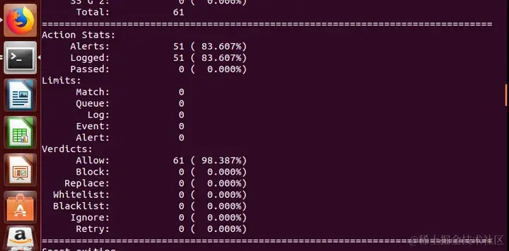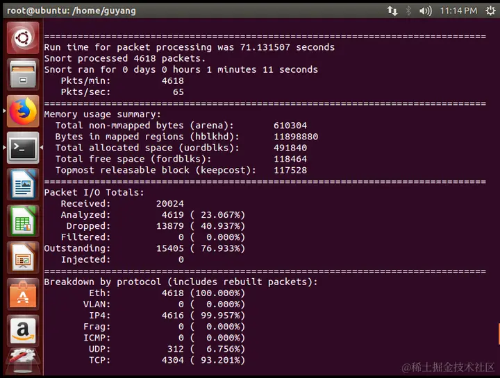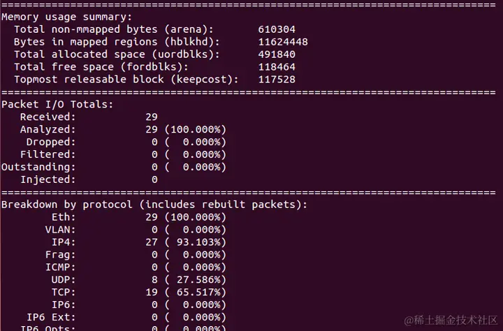 退出探测模式后,snort会给出本次探测信息的摘要总结,包括运行时间、吞吐量、内存使用、数据IO和协议分类统计等。