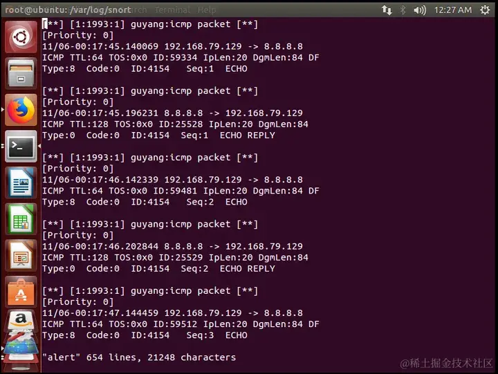 由于是alert模式,数据包的告警细则会记录到 /var/log/snort/alert中: