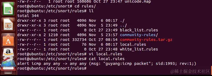 首先配置一些规则(snort规则语法),新建一个local.rules,这里试用最简单的例子,当发现任何icmp协议报文时,给出告警并记录,内容显示为guyang:icmp packet;则,语法配置如下:alert icmp any any -> ant any (msg: "guyang:icmp packet"; sid:1993; rev:1;)