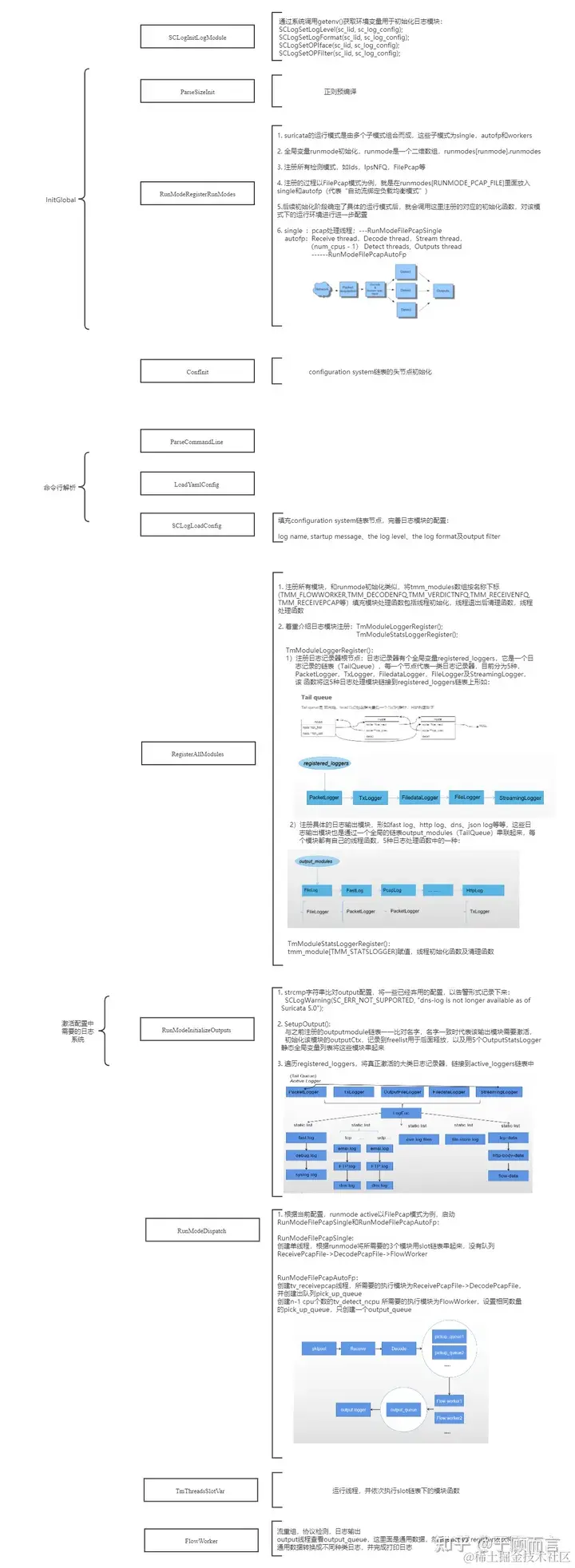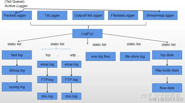 Suricata上电时,通过yaml配置文件将需要激活的output module以全局变量链表list串联起来,检测线程将数据送到output queque后,Output线程查看output_queue,队列里面是通用数据,接着会按active register依次将通用数据转换成不同种类日志,并完成打印日志