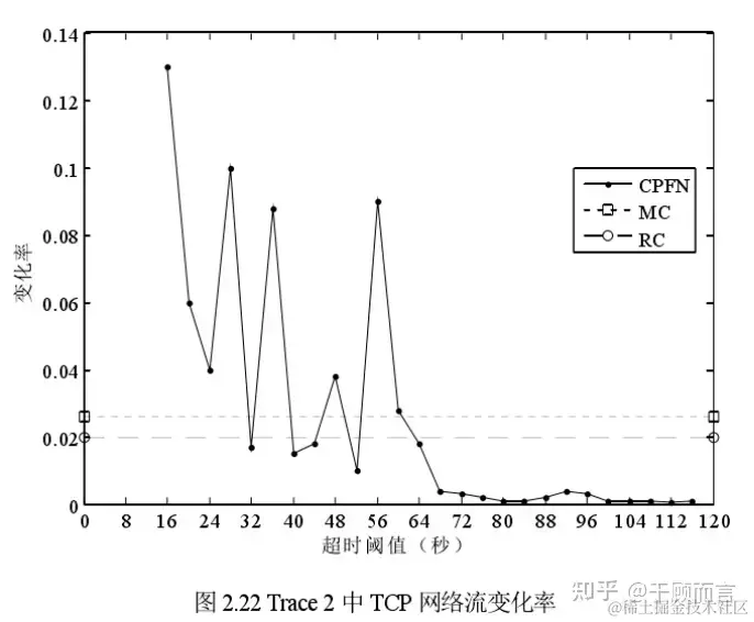 对于任意一个超时阈值 t,当使用它对某个 IP trace 进行网络流识别时,其生成的所有网络流数量记为 Ft,对于比它大的后一个超时阈值 t+tg,基于相同的 IP trace 生成的所有网络流数量记为 Ft+tg,那么就可以得到超时阈值 t 对应的网络流数量变化率,标记为 CPFNt: