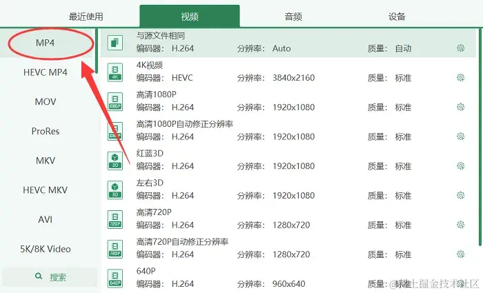 Step 2:根据需要,对视频进行参数的设置(编辑、剪辑、压缩等)。如何将mov转换成mp4?设置好后,在软件的 【输出格式】 选择需要转换的格式,找到并选择MP4作为转换格式。