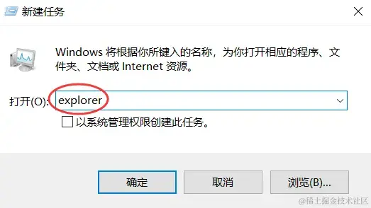 (2)输入 【explorer.exe】 ,点击 【确定】 ,稍等一会就可以恢复正常了。
