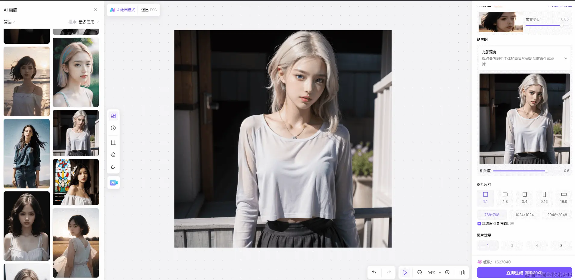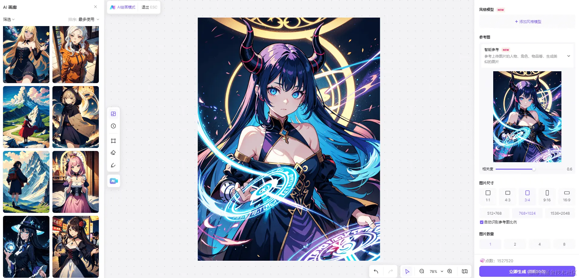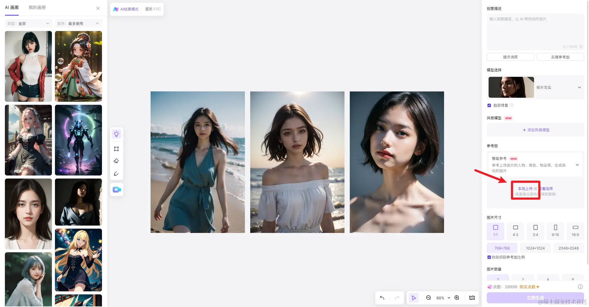 - AI 图生图-智能参考:参考上传图片的人物、角色、物品等,生成类似的图片