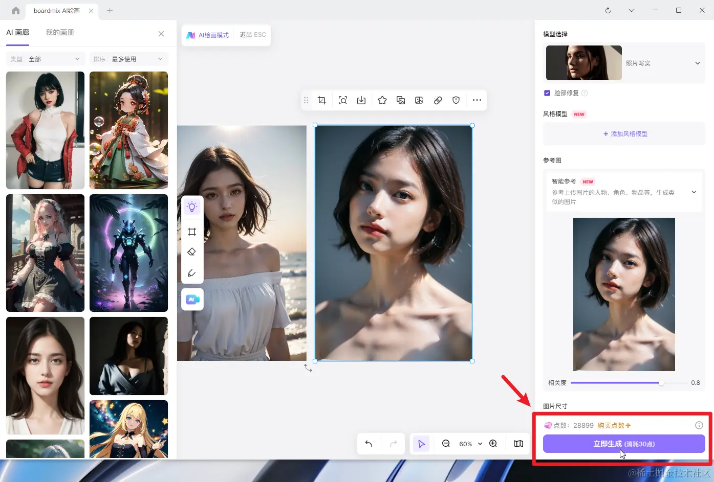 当你完成图片上传和参考模式的选择后,点击界面底部的“立即生成”按钮,boardmix AI 将开始根据你的指示创作全新的图片。
