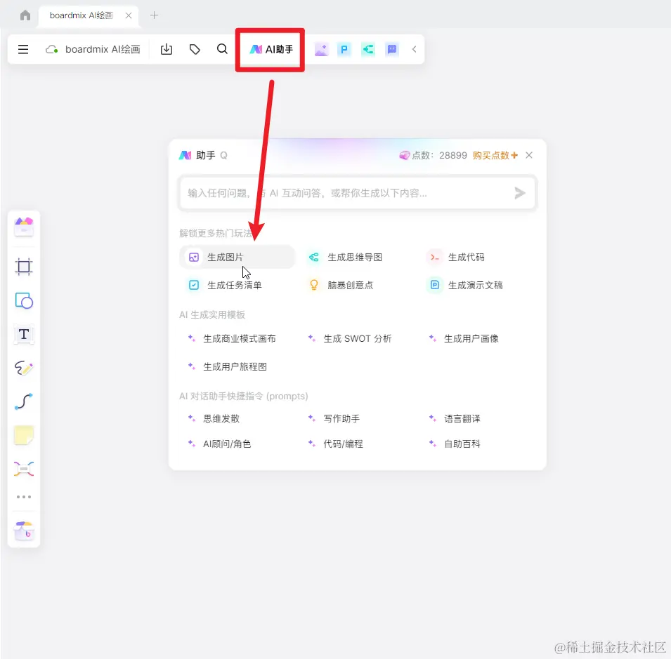 登录后,你可以在工作台界面创建一个新的白板文件。在白板界面的左上角,你将发现一个 AI 助手图标,点击图标打开 AI 助手面板,选择“生成图片”,即可进入 AI 绘画图生图的神奇世界。