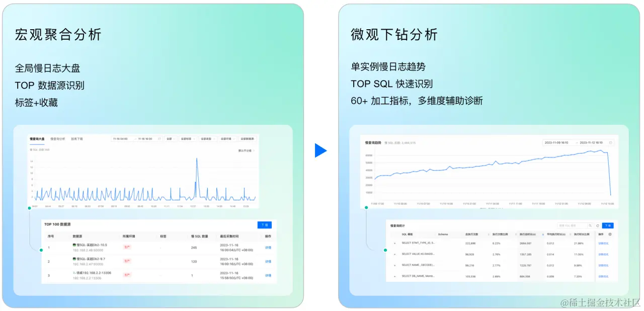 我们的慢日志大盘提供了两个层级的视图:宏观聚合分析和微观趋势分析。