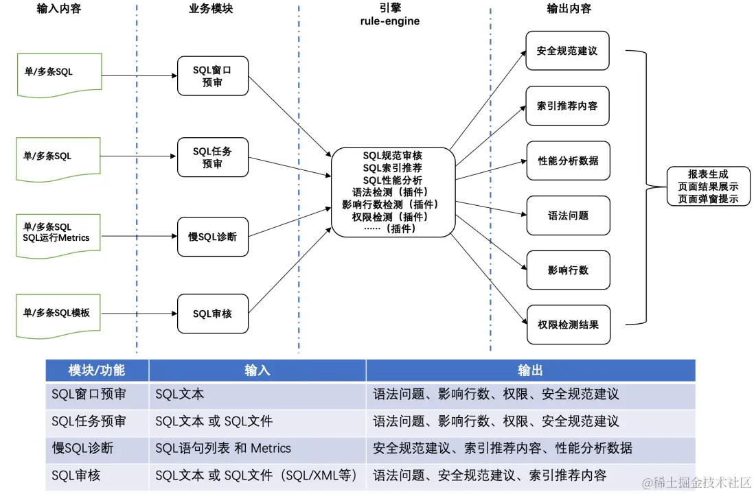 安全规范引擎本身具备插件化能力,能够灵活地对接上层功能模块、并整合各类审核检测能力,如语法检测、行数影响评估和权限检测等。它能够针对不同的业务场景和数据输入,动态生成相应的输出结果。例如,在 SQL 窗口的场景下,引擎会提供语法修正建议、影响行数的预测以及权限验证的反馈。而在慢 SQL 诊断场景中,由于 SQL 已在数据库中执行,语法问题不再是关注点,更多的是关注安全规范的建议、索引推荐以及性能优化。