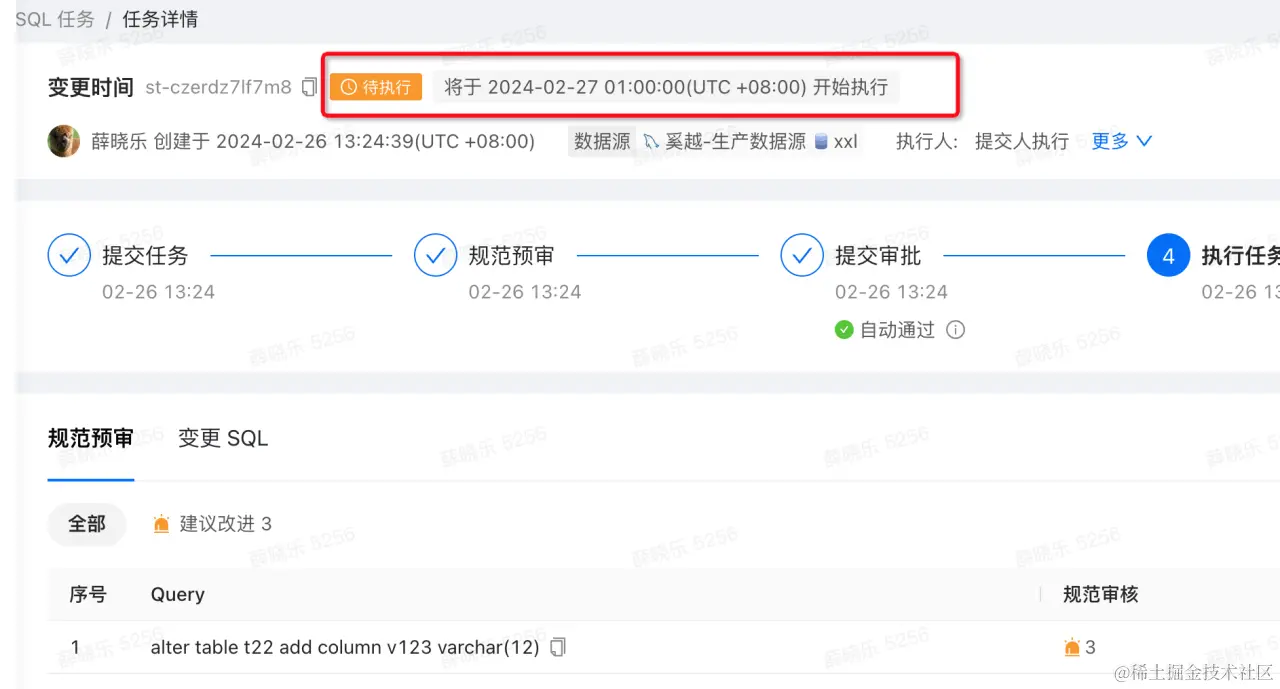 如果提交的 SQL 代码完全遵循既定规范,审批流程可以相应简化。例如,这样的 SQL 任务可能只需主管审批,或在某些情况下,可以配置为免去人工审核,直接执行。