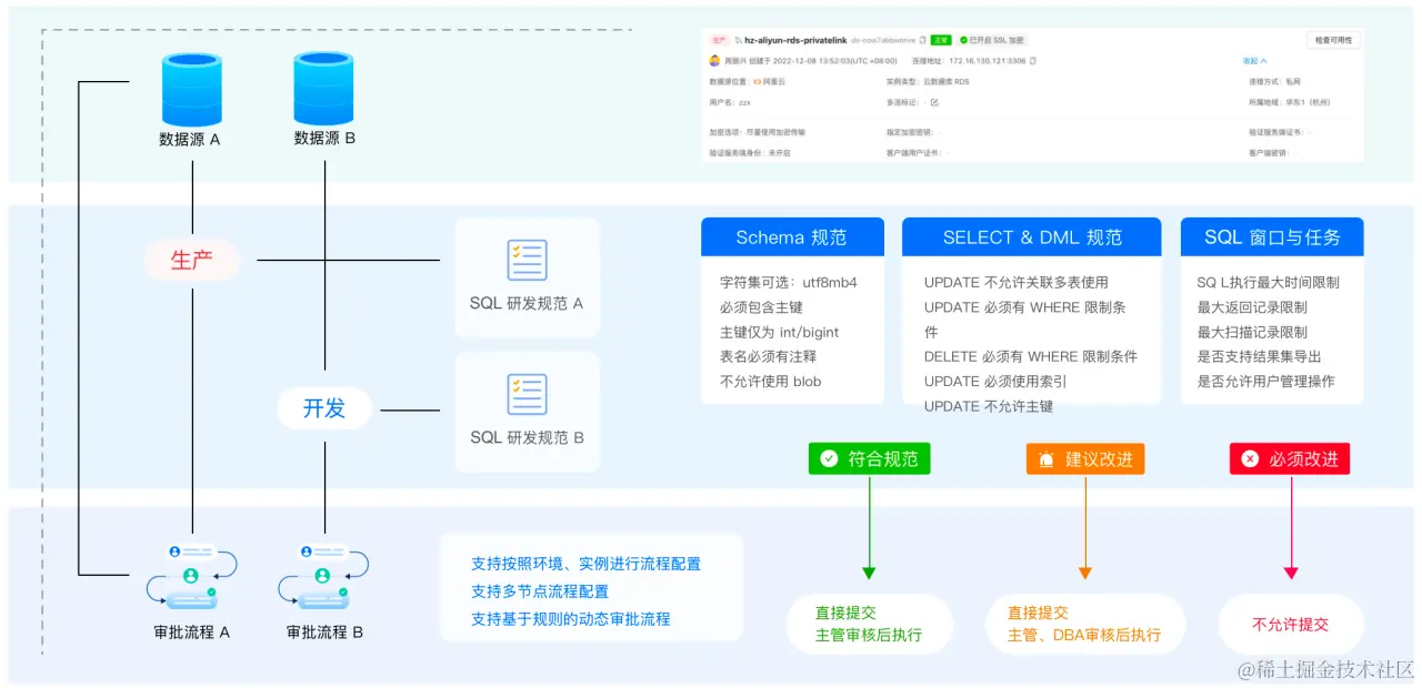具体到不同的数据库环境,生产数据库须遵守严格的开发规范和审批流程,而开发环境的数据库则可以实施较为灵活的规范和流程。这些规范和流程具备动态配置功能,可以根据不同的操作环境和需求进行调整。