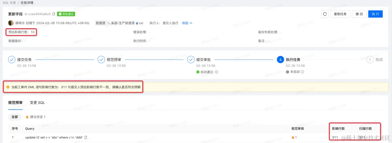 在数据变更审批前,要求用户提供一个预估的影响行数。我们会检测实际扫描与影响的行数,并向用户反馈。若实际扫描行数与用户预估存在较大差异,我们将予以提示,以避免潜在的稳定性风险。