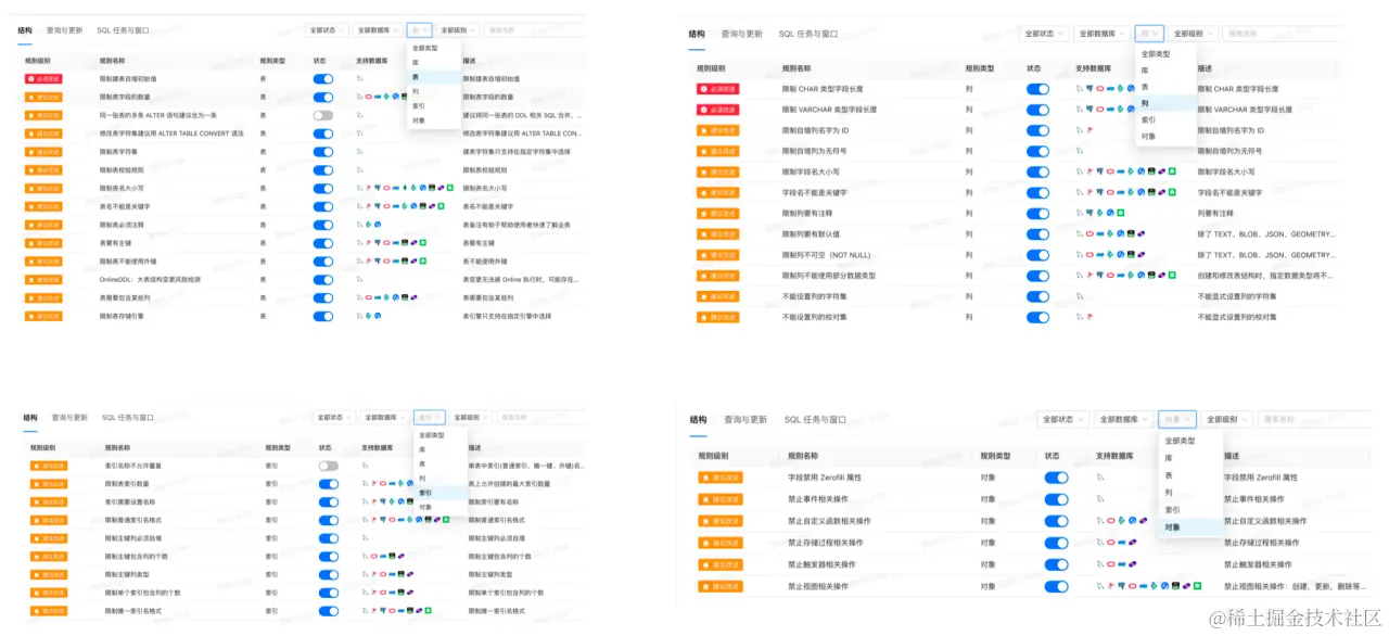 我们对结构变更类规范进行了分类,包括表级别的规范、列级别的规范、索引的规范以及非表对象的规范。