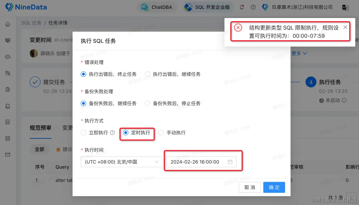时间窗口规范设置好后,当提交任务时,如果选定了下午 4 点这样一个业务高峰期时段,系统将不允许提交。系统会提示该时间段是业务高峰期,并要求选择其他时间段执行 DDL 操作。如果选择了一个合适的时间点,比如凌晨 1 点执行,那么后台的调度系统会在指定时间执行该 DDL 操作。