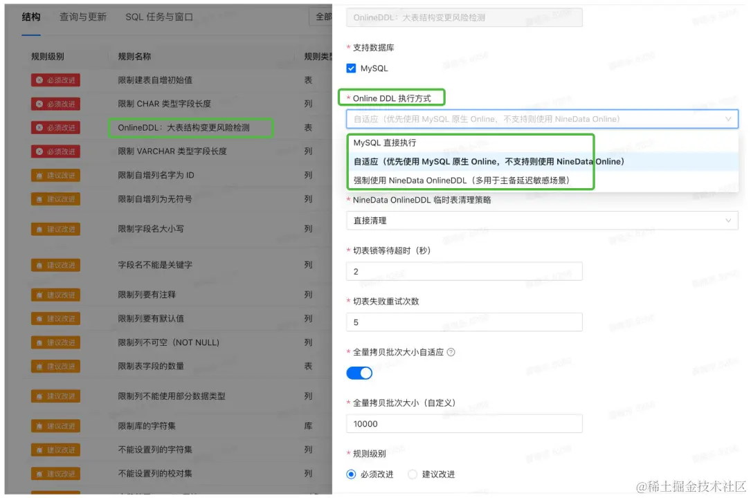 在提交任务,即安全审核阶段,我们将动态识别出 SQL 可能影响的数据行数。例如,如果一条 SQL 预计将影响 98 万行数据,超过管理员设定的阈值,且管理员已启用 OnlineDML,则当前 SQL 将通过我们的 OnlineDML 执行,以安全且无锁的方式实现数据变更。