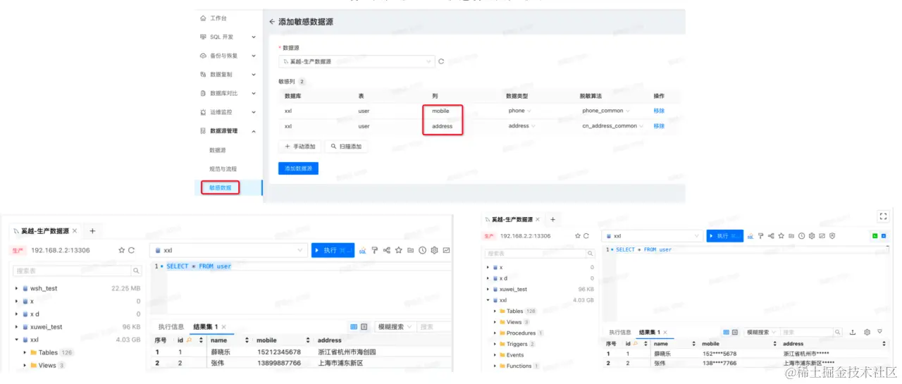 以手机号和地址信息为例,我们平台已经内置了默认的遮掩算法。在应用脱敏规则之前,用户能够在用户表中明文看到完整的手机号和地址信息。然而,一旦脱敏规则启动,并且如果用户未被授权访问这些敏感列,他们将只能看到被加密或者遮掩处理过的数据。