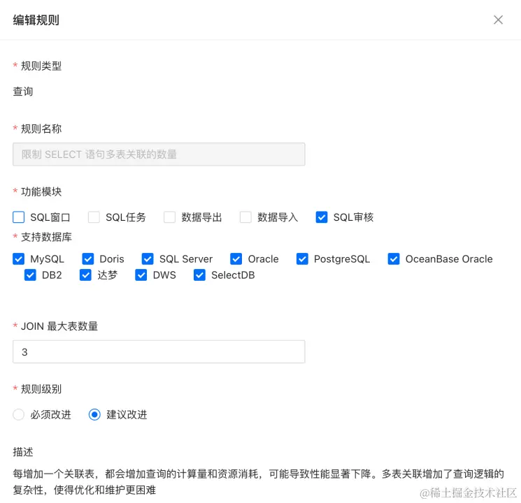 进一步地,我们还能够对每个规范条目进行细致的配置。规范可以根据需求开启或关闭,并且可以针对特定的业务模块进行定制化的应用。例如,在下图中展示的规范,我们限定了 SELECT 语句在进行多表关联时的数量。这样一个具体的规则可以被设置为仅在应用代码的 SQL 审核中有效。