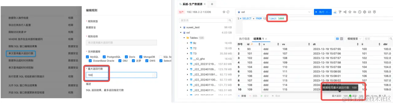 基于对数据库性能和网络带宽的考量,同时也是为了预防数据过量泄露的安全风险。我们设立了“单次查询最大返回行数”的具体规则。