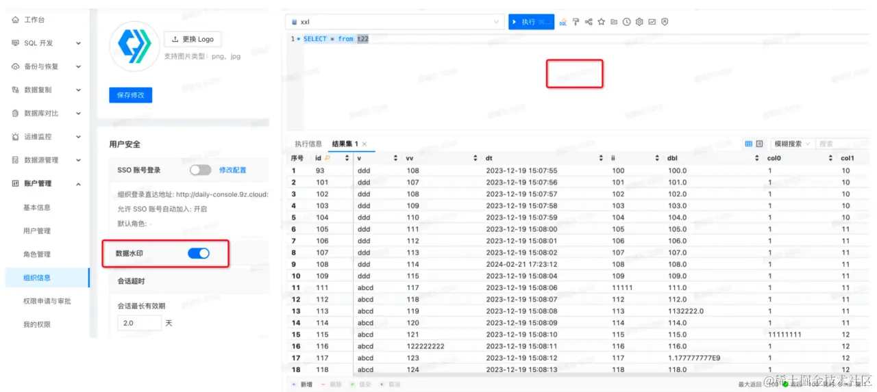 在企业内部,即便我们提供了查询功能,仍难以避免一些情况,比如员工可能会截图查询结果并分享至其他地方,这构成了数据安全风险。为此,我们引入了数据水印功能。