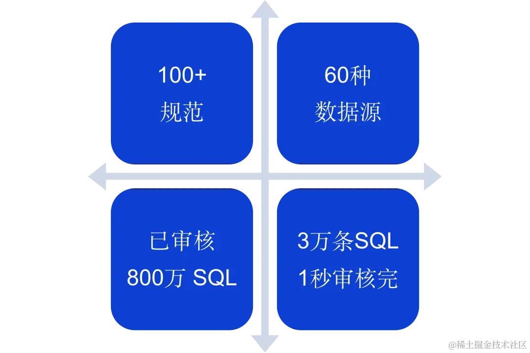 安全规范引擎自发布以来已经支持了 100 多条规范,并且覆盖了 60 多种数据源,包括开源数据库、云数据库以及国产数据库。到目前为止,我们已经在线上执行了 800 万次 SQL 审核。我们也对安全规范引擎进行了性能优化,可在一秒钟内完成 3 万条 SQL 的审核。