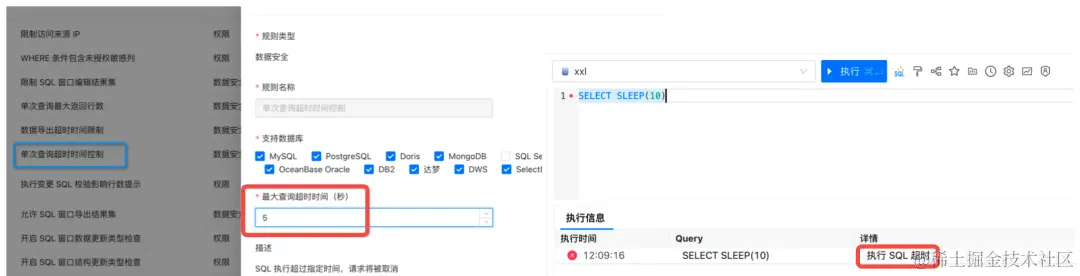 我们给每个数据源设置最大查询超时时间限制,例如 5 秒。若用户执行的 SQL 语句需要 10 秒才能完成,一旦执行时间达到 5 秒,我们的平台将自动终止该查询,并返回超时错误,从而有效避免慢 SQL 对数据库稳定性的影响。