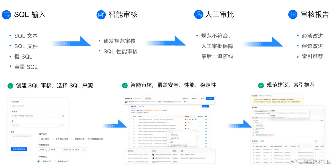 首先,用户可以将业务代码中的 SQL 以文本形式提交,或者指定数据源以便我们收集慢查询或全量 SQL。收集后的 SQL 将通过我们早先提到的安全规范引擎进行审计。对于慢查询或全量 SQL,我们会分析它们的执行指标,如响应时间、扫描行数、缓存利用率等,以此为基础进行性能分析和提出诊断建议。