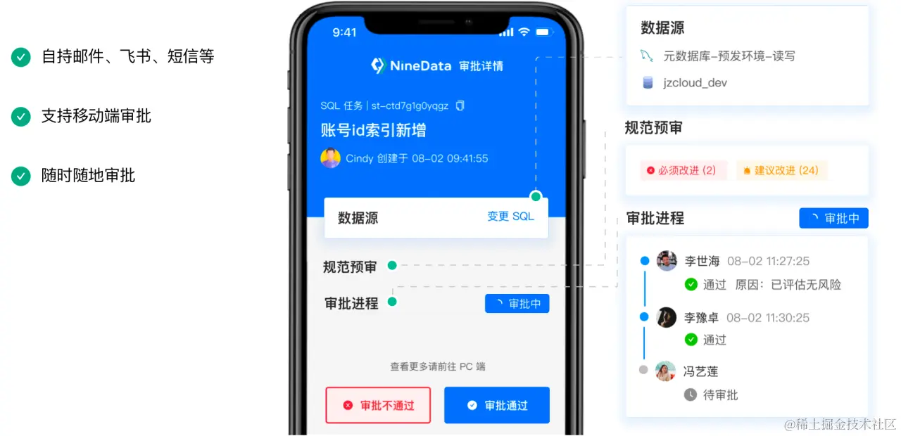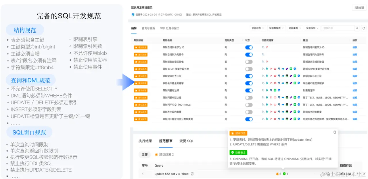 数据库是存储关键信息、支持业务运营和分析决策的基石。然而,数据库的复杂性——研发效率低、安全管控难、变更不稳定、数据管控难,和对其稳定性、安全性的极高要求同样使得它们成为企业 IT 结构中的一个脆弱环节。通过数据库规范的建设,NineData平台目前已支持100+规范,覆盖60种数据源,已审核800万 SQL,实现3万条 SQL 1秒审核完。详细的实践方法和细节,请参阅文章正文。