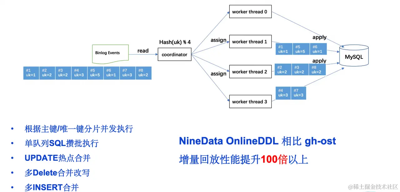 - Online DDL性能优化:增量并行处理、热点合并等优化,解决原 gh-ost 高 TPS 情况下无法完成变更的问题。