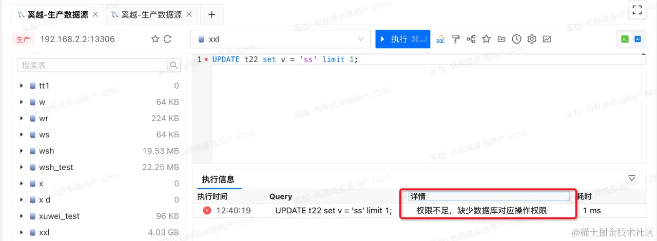 如图所示,某个用户可能只具有对生产数据源的只读权限,在 SQL 窗口模块中也仅限于只读操作。如果该用户尝试执行 UPDATE 语句,系统会提示权限不足,并要求用户具备相应的数据库操作权限。这种集中化权限控制确保了操作的合规性和安全性。