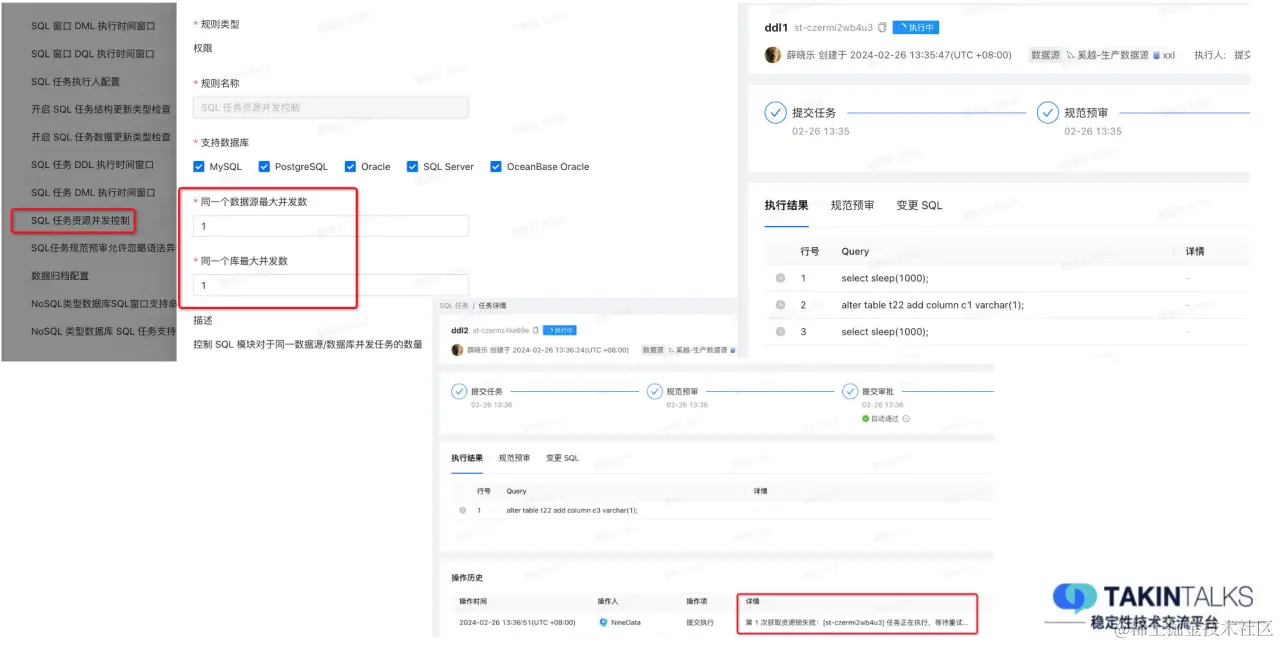 例如,如果配置规定同一时刻只能有一个 DDL 变更正在进行,那么当第一个 DDL 变更任务提交并开始执行后,它可以正常进行。但在此期间,如果有其他研发提交了针对同一数据源的 DDL 任务,那么该任务将会在尝试获取数据源资源锁时失败,因为系统检测到已有一个 DDL 任务在执行。新的任务必须等待,直到第一个任务完成后,才能开始执行。这样的并发控制机制确保了 DDL 任务可以串行化执行。