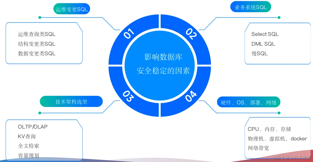 那么,究竟是什么核心因素影响着数据库安全稳定性?首先,我们通过 SQL 语句与数据库进行交互。这些 SQL 分为两大类:运维变更 SQL 和业务系统 SQL。运维变更 SQL 包括查询、结构变更、数据变更等,它们的编写与执行对数据库的运行至关重要。而业务系统 SQL,则是开发者在应用代码中嵌入的,主要是查询和DML,它们中的低效查询,俗称“烂 SQL”或“慢 SQL”,对数据库性能有直接影响。