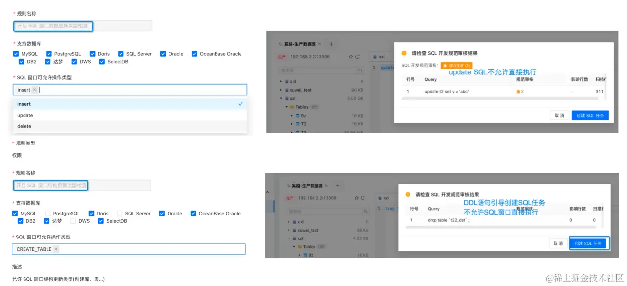 管理员能够根据实际情形动态配置这些审查规则,实现安全规则引擎与审批流程的灵活绑定,确保只有合规的 SQL 能够被执行,既最大化了开发效率,又确保了线上系统的安全与稳定。