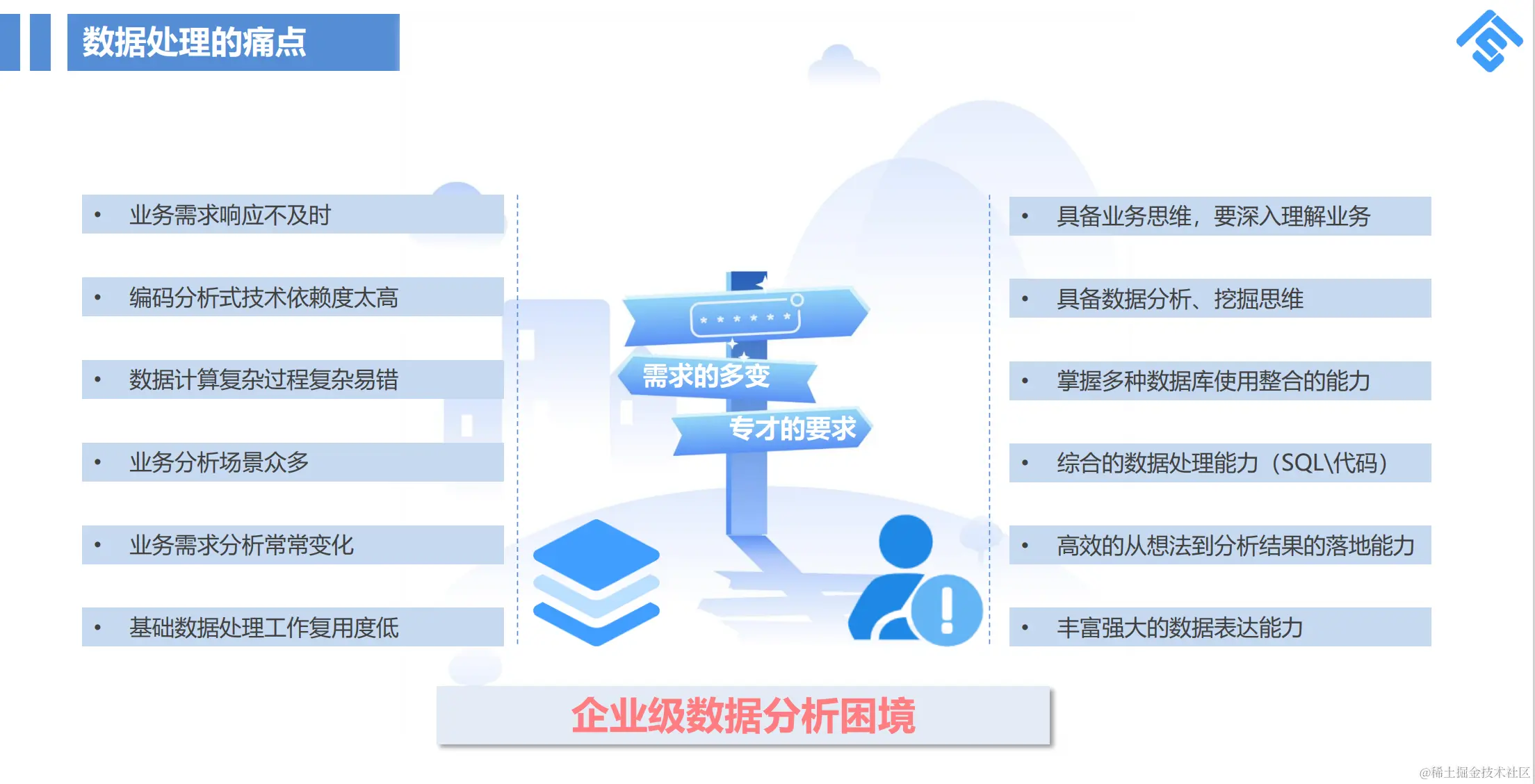 - 降低数据分析的使用门槛,让更多的人用起来,特别是靠近业务的人,让懂业务的人也会使用数据分析