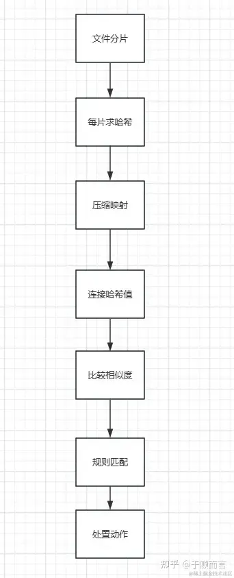 将流量进行文件还原,通过同样的指纹生成算法,计算出被扫描文件的指纹数据,通过精确匹配和相似度匹配确定是否命中管理员配置的防护规则,比如说发生的邮件与公司机密文件相似度高达40%就进行阻断等等。借用开源GitHub - ssdeep-project/ssdeep: Fuzzy hashing API and fuzzy hashing tool,整体流程如下: