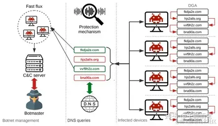恶意软件利用DGA算法与C2服务器进行通信的原理如图所示,客户端通过DGA算法生成大量备选域名,并且进行查询,攻击者与恶意软件运行同一套DGA算法,生成相同的备选域名列表,当需要发动攻击的时候,选择其中少量进行注册,便可以建立通信,并且可以对注册的域名应用速变IP技术,快速变换IP,从而域名和IP都可以进行快速变化。