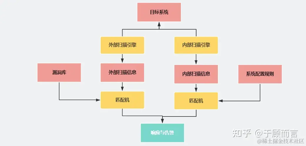 外部扫描引擎通过远程检测目标主机TCP/IP不同端口的服务,记录目标的回答,通过这种方法可以搜集到很多目标主机的各种信息 (比如: 是否能用匿名登录,是否有可写的 FTP目录,是否能用TELNET, HTTPD是用 root还是nobody 在运行 ) 。在获得目标主机TCP/IP端口和其对应的网络访问服务的相关信息后,与漏洞库中的漏洞规则进行匹配 ,满足匹配条件则视为漏洞。
