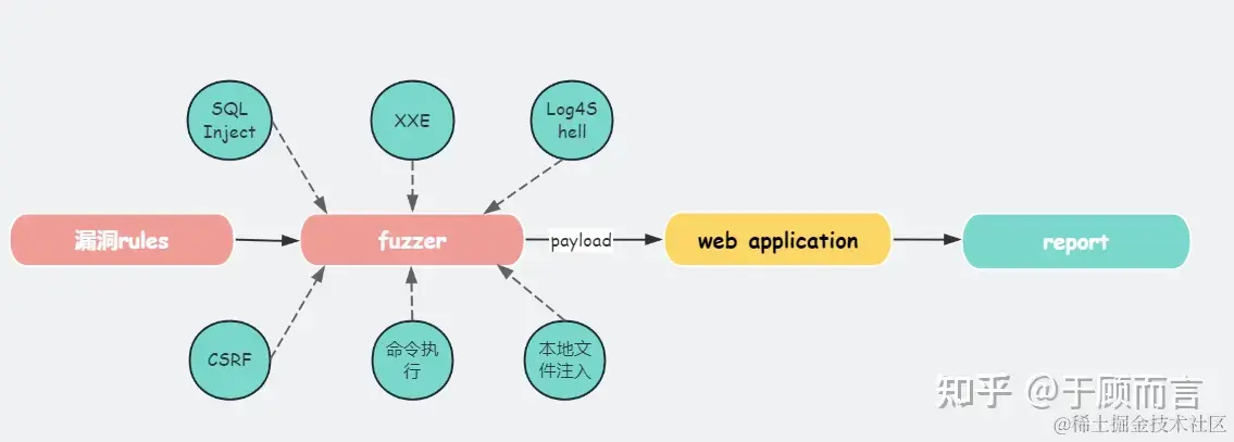 对Web应用程序执行黑盒安全审计,基于Python,它通过自身的漏洞规则库,使用fuzzer生成器生成一系列的漏洞报文,并通过GET和POST请求发送到目标站点来扫描漏洞,框架如所示: