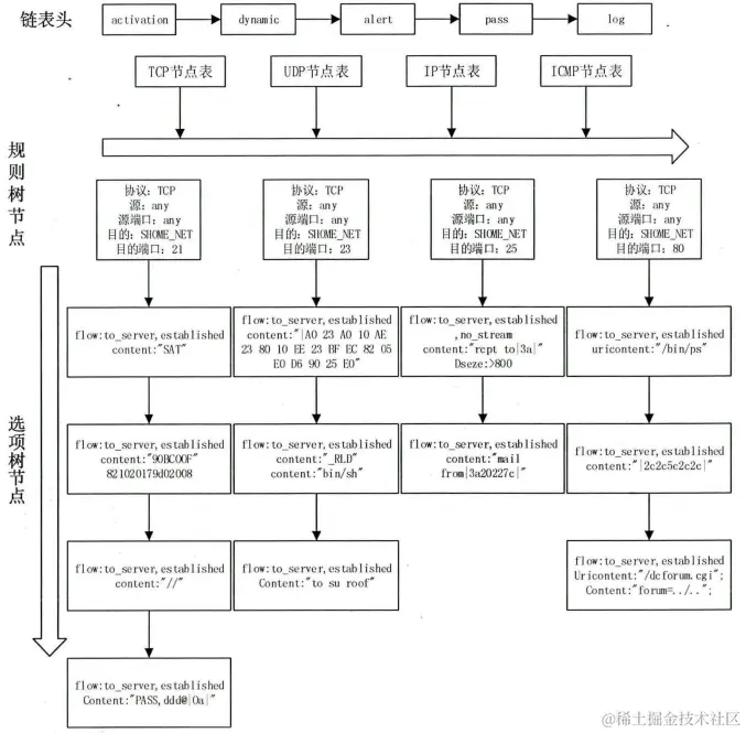 - 检测引擎:规则建立(多维链表)+规则匹配
