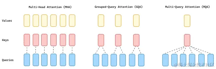GQA(Grouped Query Attention)将 query 的值分为 G 组(GQA-G),这些 query 组共享一个 key head 和一个 value head ,位于 MHA(Multi-Head Attention)和 MQA(Multi-Query Attention)之间。GQA-1 表示所有的 query 都聚合在一组中,因此与 MQA 相同;而 GQA-H(H 为 head 的数量)相当于 MHA,其中每个 query 都被视为一个组。