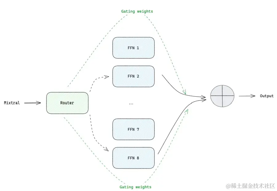 - 稀疏混合专家层(Sparse Mixture of Experts layers) :用于取代密集的前馈神经网络(FFN)层。例如,Mixtral 8x7B具有8个SMoE层,即8个专家模型,每个专家模型专门处理一组 tokens 。例如,可以是标点符号专家模型、视觉描述专家模型或数字专家模型。