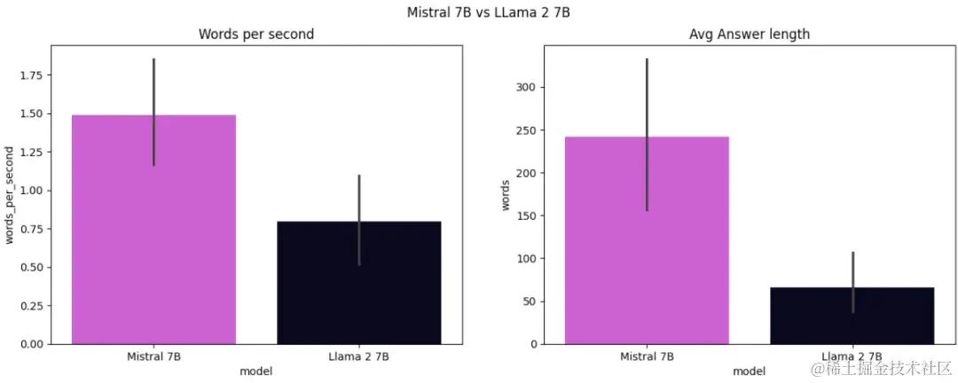 完成后绘制指标图,可以看到,Mistral 7B比Llama 2 7B快得多,平均每秒产生约1.5个单词,而Llama 2 7B平均每秒只产生约0.8个单词。 此外,Mistral 7B生成的答案更完整,平均答案长度为 248 个单词,而Llama 2 7B只生成了由 75 个单词组成的句子。