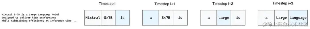回到之前的例子,窗口大小为3。如图5所示,在处于第 i+1 个时间步(time step)时,如果模型要生成第四个 token ,第一个 token 将会被替换。