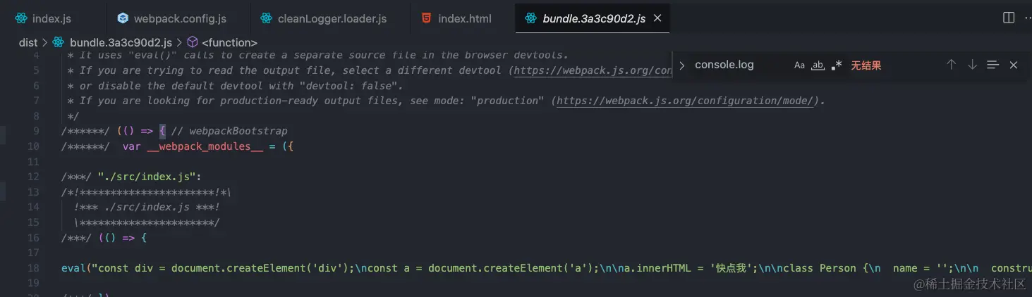 执行 webpack 命令后生产文件中,我们会发现打包文件中无法找到 console.log 的代码