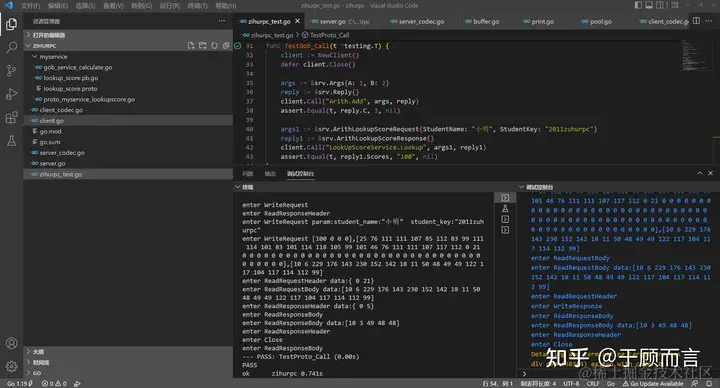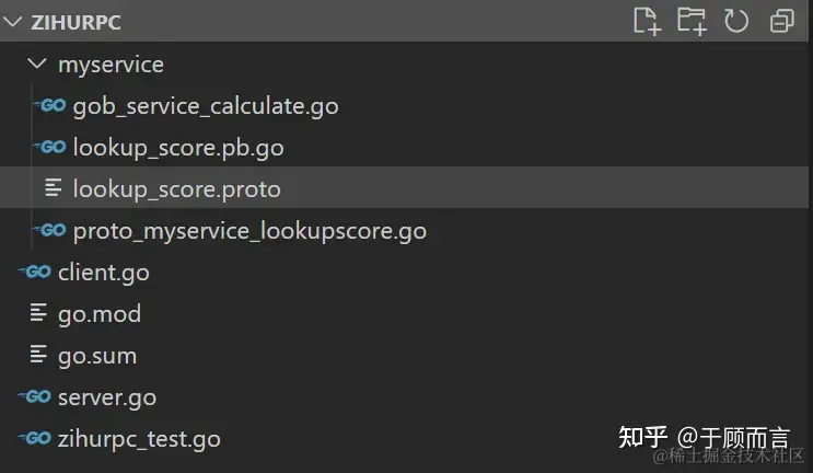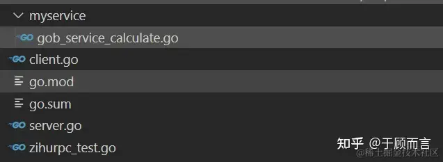 我自己新建一个工程叫zihurpc,然后将这个例子的源码按功能拆分到四个文件中:测试用例,rpc客户端实现,rpc服务端实现,以及一个目录myservice包含可以对外提供的各种服务: