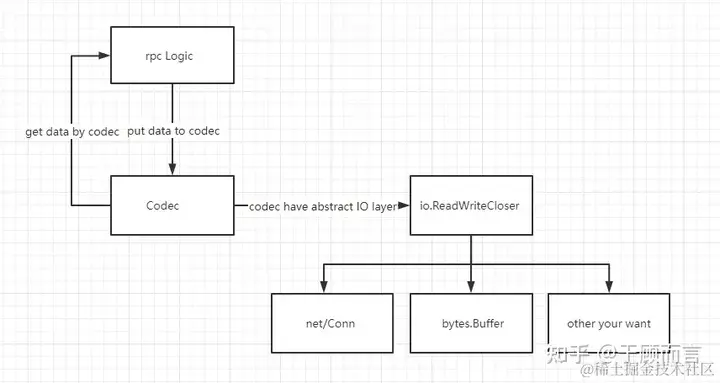 从这个例子从可以看到,net/rpc默认采用gob编解码,net库用于网络通信。仔细查看net/rpc代码结构发现其架构非常灵活,它通过codec将数据处理与io分开,数据处理可以自定义自己的头部格式和Marshall/unMarshall方法,io可以是 net/Conn,bytes.Buffer或者是自定义的io方法: