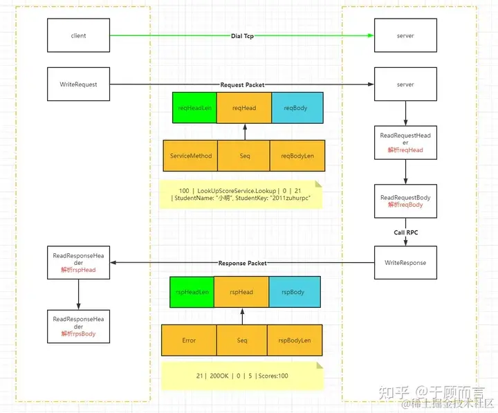 server端WriteResponse的逻辑首先会将响应的头部信息组装成一个byte,然后再把响应的返回值做一个proto.Marshal(body),再然后先把头部信息的长度发出去,再依次发送响应的头部信息和序列化后的远程函数调用的返回值: