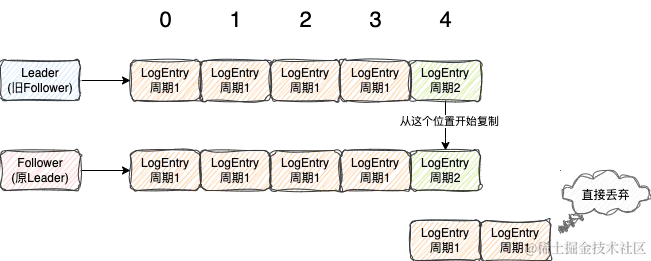 按照图上复制进度我们可以看出,已经被超过半数节点成功复制的LogEntry就是index=4的那个LogEntry